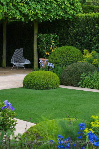 BuchsbaumkugelBuxus sempervirensCitrusFormschnittIris germanicaLindeRasenSchirmgehölzTilia x europaeaTravertinZitrone
