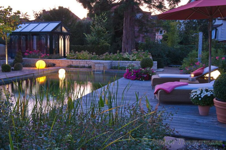 AbendBeleuchtungHolzdeckLichtSchwimmbeckenSchwimmteich