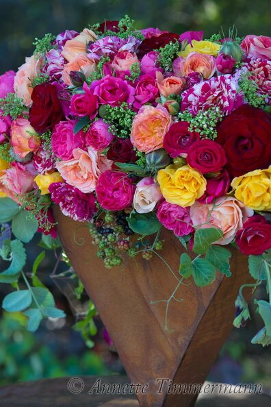 Blecheimer mit Srauß mit roten Roasen 'Schöne Koblenzerin'