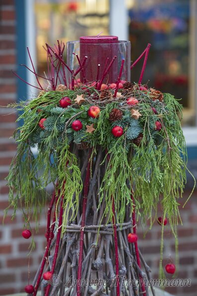AdventDekoGesteckKerzeKöhler FloristLebensbaumTanneThujaZierapfelZweige
