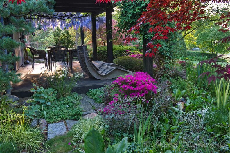 AhornIrisJapanJapangartenKieferSchattenWasserfall