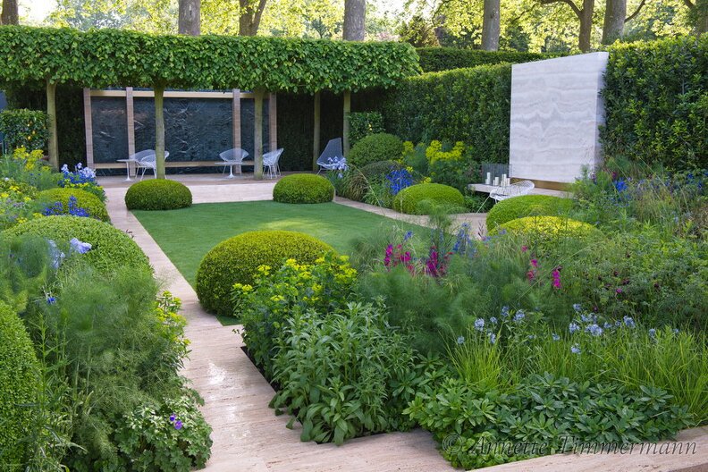 Anchusa azureaBuchsbaumkugelBuxus sempervirensFormschnittLaurus nobilisLorbeerOsmanthus x burkwoodiiRasenTravertin