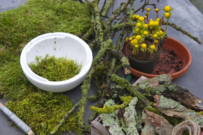 bastelnDeko mit WinterlingenDIYEranthis hyemalisMoosWinterlingeZweige