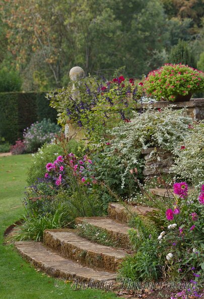 Coton Manor GardensDahliaDahlia 'Fascination'Helichrysum petiolareIan und Susie Pasley-TylerIlexNatursteinTreppe