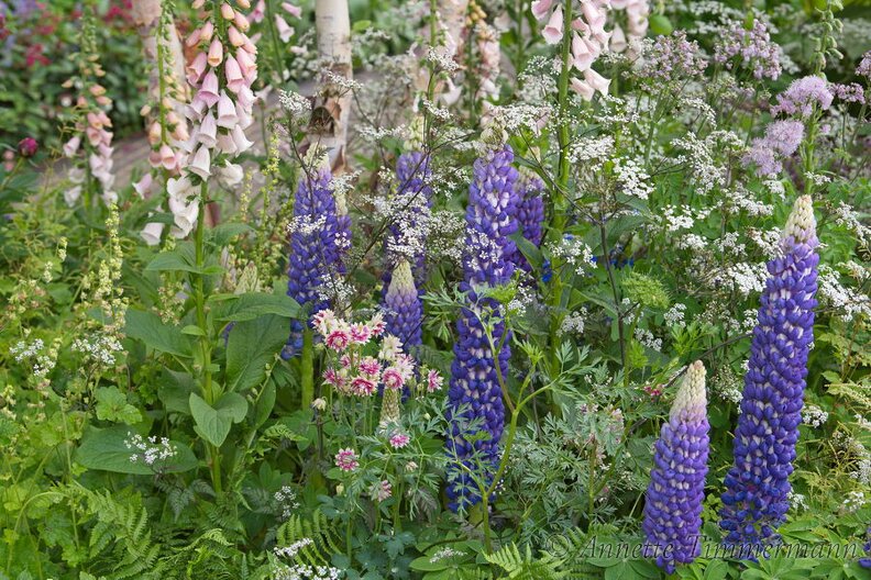 Betula nigraDavid Harber and Savills GardenDigitalis purpurea 'Sutton'sApricot'Lupinus ‘West Country Persian Slipper’