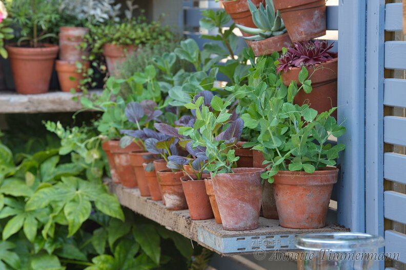 ErbsenGemüsesetzlingeJungpflanzenRegalTontöpfe