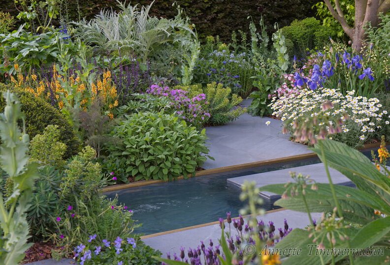 Anthemis punctata subspcupanianaCynara cardunculusEuphorbia characias ‘Black Pearl’Iris barbata-Elatior-Hybride 'Jane Phillips'Verbascum 'Clementine'WasserbeceknWasserrinne