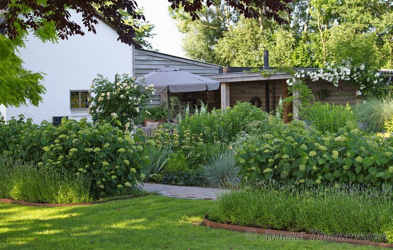BlaustrahlhaferCortenstahlgelbHelictotrichon sempervirensHydrangea arborescens 'Strong Annabelle' oder 'Incrediball'Rose 'The Pilgrim'