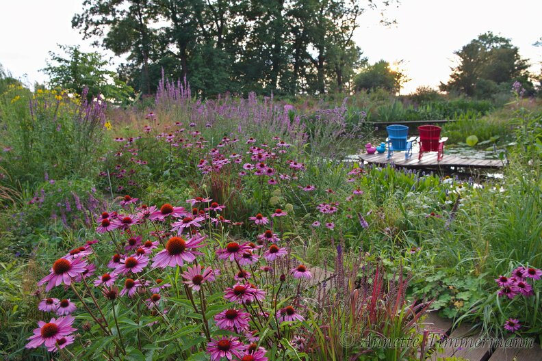 Adirondack ChairCalamagrostis x acutiflora 'Karl Foerster'Deschampsia caespitosaEchinacea purpurea 'Magnus'Eryngium planum 'Blaukappe'HechtkrautLythrumPanoramaPontederia cordataSitzplatzStegTeichVerbena bonariensisVerbena hastata