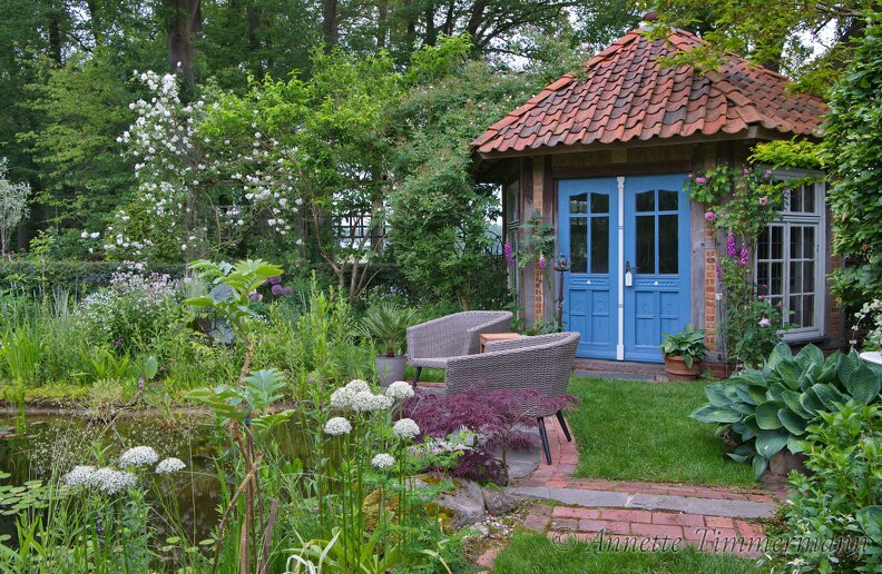 GartenhausPavillonRose 'Dentelle de Malines'Rose 'Mme Alfred Carrière'SitzplatzTeich