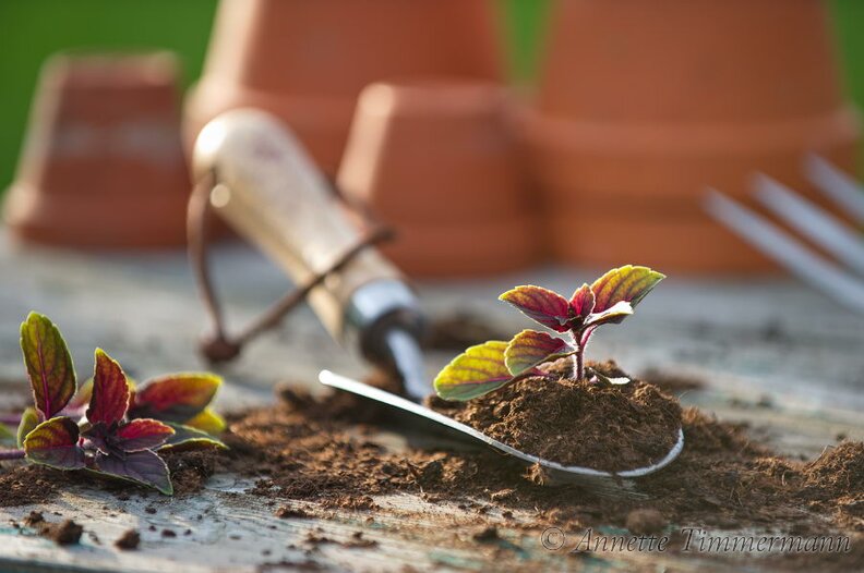 BlumenerdeGartenschaufelJungpflanzenTisch