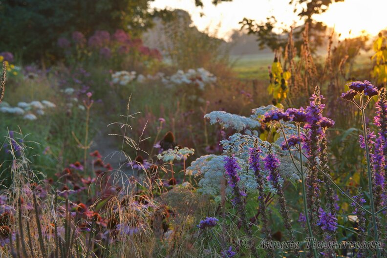 Cortia wallichianaDeschampsia caespitosaEchinacea purpurea 'Magnus'EupatoriumGartenhausHolzKaschmir-DoldeLythrumPräriesonnenhutRatibida pinnataSelinum wallichianumVerbena bonariensisWeg