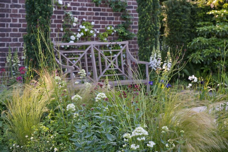 BankCentranthus ruber var. coccineusDigitalisLuzula sylvaticaMauerRosa 'Madame Alfred Carriere'Wasserbecken