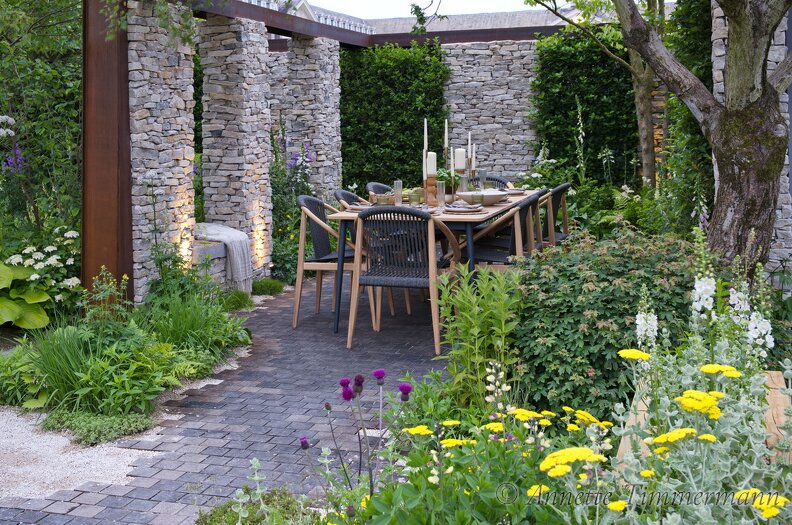 Acer campestreAmur-KorkbaumCortenstahlgedeckter TischNatursteinPergolaPhellodendron amurensePrunus lucitanicaSamtbaumSandsteinSitzplatzTerrasse