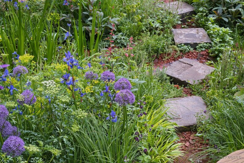 CraspediaEuphorbia cornigeraGeum 'Scarlet Tempest'Geum 'Totally Tangerine'TrittsteinTrommelstöckchenVerbascum 'Cotwold Beauty'