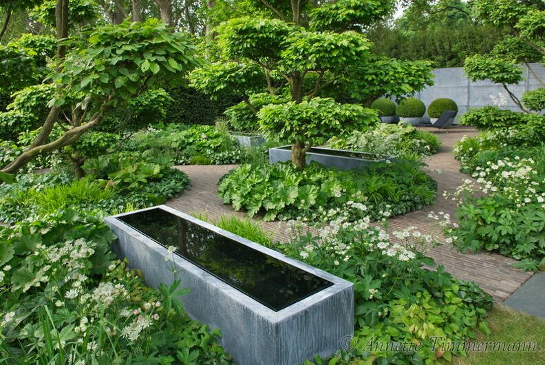Epimedium, Hosta, Buchs, Rhododendron