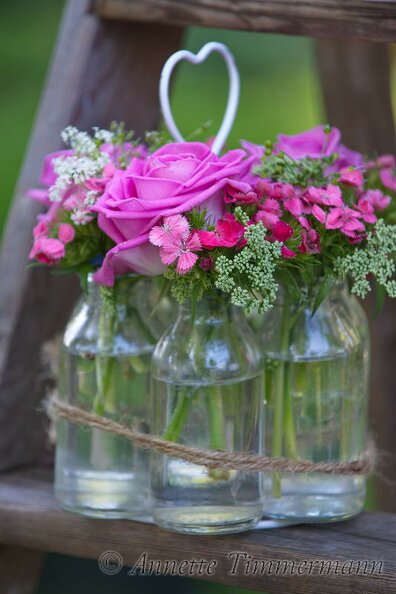 bunter Strauß mit Rosen in weißer Glasvase