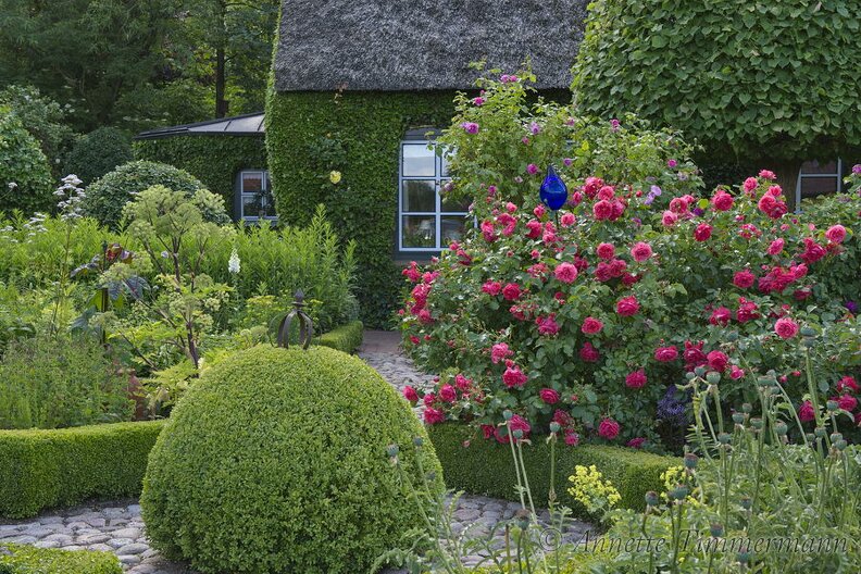 BauerngartenBauernhausBuchsbaumkugelDigitalisFeldsteineLindenLupineReetRose 'Rosarium Uetersen'Rose 'Rose de Resht'Weg